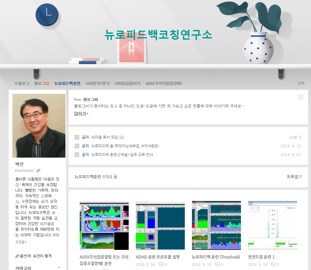 미분류 최종업데이트 : 18/10/2024 조회수 : 54 뉴로피드백코칭연구소 Bloghttps://blog.naver.com/braintrainerWritten by: nfci table of contents https://blog.naver.com/braintrainer 답글 남기기 응답 취소이메일 주소는 공개되지 않습니다. 필수 필드는 *로 표시됩니다댓글 * 이름 * 이메일 * 웹사이트 다음 번 댓글 작성을 위해 이 브라우저에 이름, 이메일, 그리고 웹사이트를 저장합니다. previous해외 뇌파 장치 목록보기RELATED POSTSCheck other posts you may like2023년 12월 23일해외 뇌파 장치뇌과학적으로, 정신 활동 상태를 추적, 분석하는 간편한 방법이 뇌파 측정입니다. 기록된 뇌파의 정신활동을 평가하고, 실시간 뇌파를 활용하여 정신 조절 기능을 […]2023년 12월 23일정신 기능의 최적화<음악을 들을 때의 뇌 활성 상태> 인체는 체온, 심박동, 혈당, 체액, 면역체계, 소화계 등과 같은 시스템들이 자가 조절을 통해 최적화되는 […]