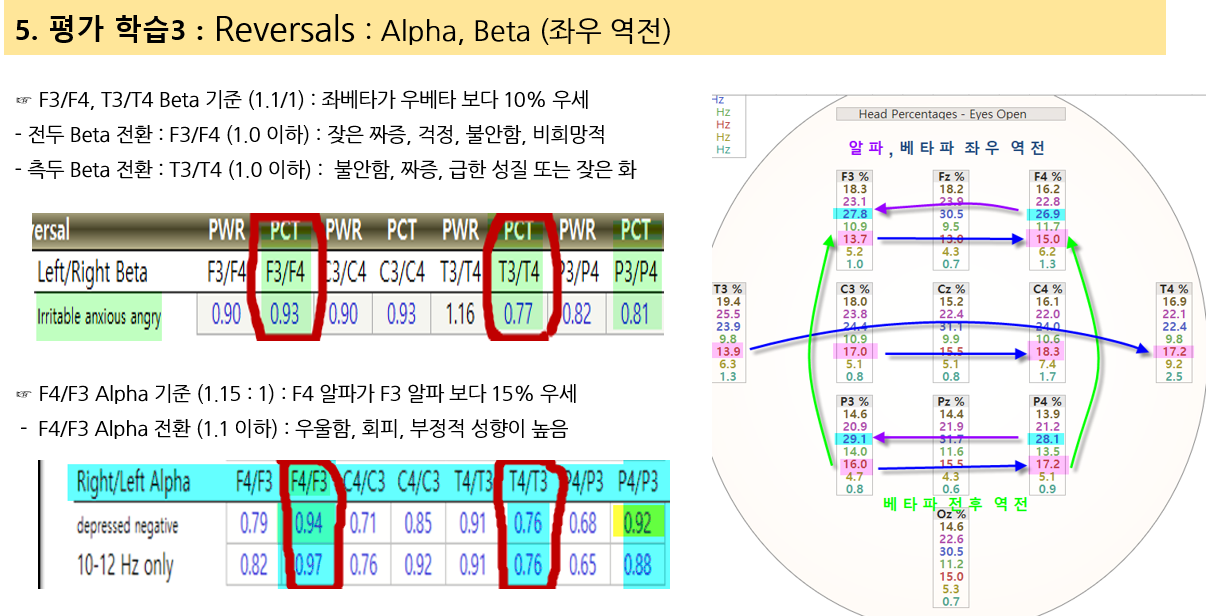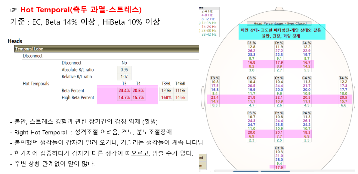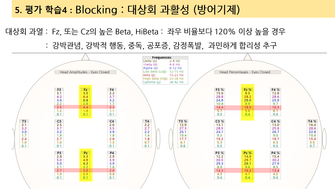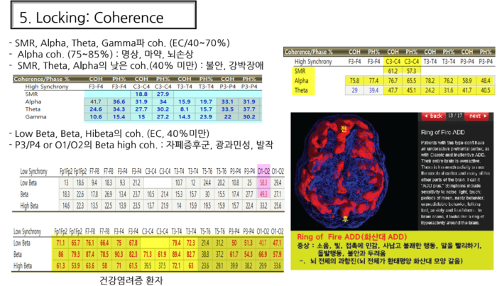 불안, 강박적 증상은 좌우반구의 협응성, 일관성을 저조하게 합니다. 저속파의 낮은 코히어런스는 기억력 저하, 왜곡된 성격이나 성향을 판단할 수 있습니다.