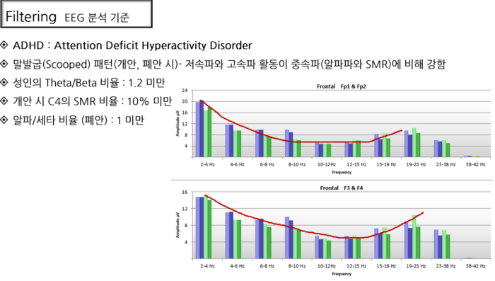 ADHD는 Slow파와 Fast파의 과도한 활성과 Mid파의 저조한 활성이 특징입니다. 너무 빠르거나 지나친 정신활동은 안정된 인지기능을 방해하며 충동적 성향의 주 원인이 됩니다. 불필요한 에너지가 낭비되는 과도한 활동성의 안정을 위한 훈련이 요구됩니다.