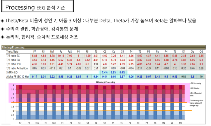 학습능력, 수행능력, 예술능력, 경기력 등은 주요 피질의 이완, 각성, 활성상태에 따라서 영향을 받게 됩니다. 폐안, 개안 상태의 활성 정도를 판단하여 ADD, ADHD 증후군과 관련된 뇌 기능성을 확인할 수 있으며, 인지 기능 향상을 위한 훈련 프로토콜을 결정할 수 있습니다.